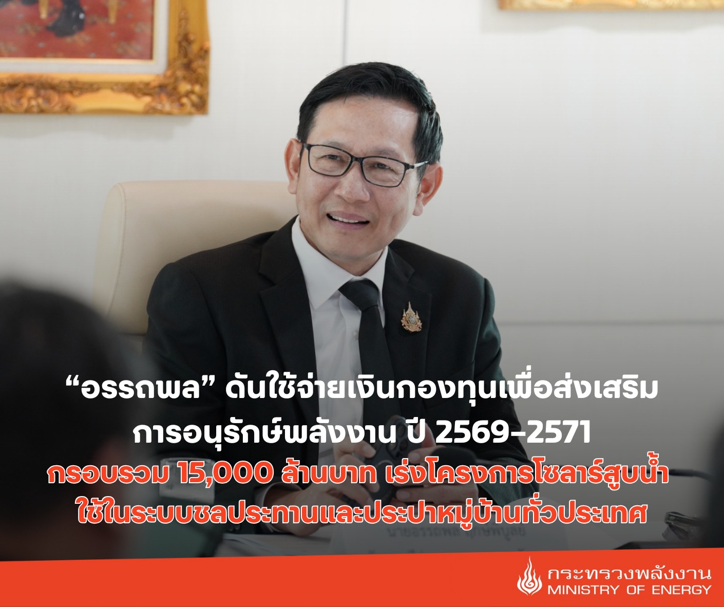 "อรรถพล" รมว.พลังงาน เสนอที่ประชุม กพช. อนุมัติแนวทางและหลักเกณฑ์การใช้จ่ายเงินกองทุนเพื่อส่งเสริมการอนุรักษ์พลังงาน ปีงบประมาณ 2569 – 2571 กรอบรวม 15,000 ล้านบาท (ปี 2569 จำนวน 9,000 ล้านบาท) ส่วนหนึ่งเป็นโครงการโซลาร์สูบน้ำ มีเป้าหมายในการกระจายระบบพลังงานแสงอาทิตย์ไปใช้ในระบบชลประทานและประปาหมู่บ้านทั่วประเทศ